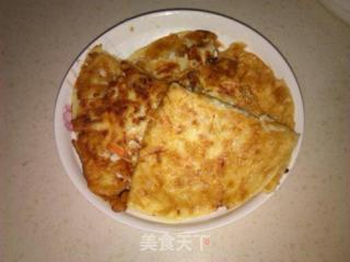 点击查看大图6.底面煎至金黄时,准备翻身,我没翻好,嘻嘻,只翻了一半,就这样煎了,如果一直翻会把饼弄破的,就煎一面,口感会更嫩一点。