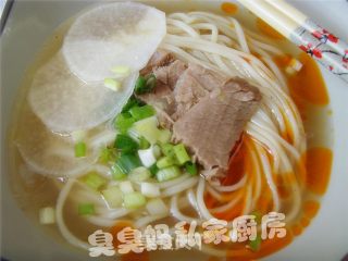 点击查看大图8.锅入加适量水烧开,下入面条,煮熟后捞出;萝卜片焯一下,放入凉水冷却,以去萝卜的异味。