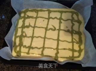 点击查看大图11.将全部蛋糕糊倒入烤盘里抹平,表面再挤上抹茶糊