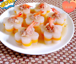花环形的萝卜酿虾球,不单吸引眼球!而且简单易做,结合鲜虾和肉的香甜,口感绝对杠杠滴。