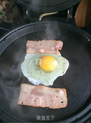 点击查看大图6.关键来了,将已煎好一面的培根翻盖在鸡蛋上方,焦黄的贴在鸡蛋上,因为是使用的电饼铛,是双面加热的,上板会将培根煎出一个漂亮的颜色