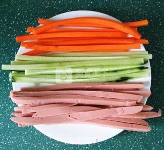点击查看大图3.黄瓜、火腿和胡萝卜切长条