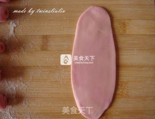 点击查看大图2.制作水油皮面:取中筋粉:100g,糖:10g,水:50ml和白油15g,和成白色面团。 取中筋粉:100g,糖:10g,水:50ml和白油15g,适量粉色色素和成粉色面团。和面后盖保鲜膜饧制20分钟。