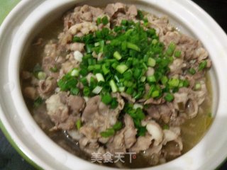 点击查看大图9.把烫熟的羊肉卷连同汤汁一起倒入盛有酸菜金针茹的砂锅中。