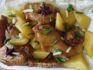 点击查看大图8.锅里重新倒点油,把八角,姜蒜放进去煸香,煸香之后把土豆和鸡翅一起放入,稍稍炒会。