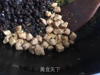 点击查看大图7.中火下腌制好的肉丁翻炒3-5分钟至断生变色,下豆豉中火翻炒3分钟后转小火继续翻炒5分钟。