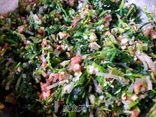 点击查看大图5.萝卜缨剁成馅料放入容器中还有鲜肉、粉条、葱、姜、香菜放入调味料油、盐、味精