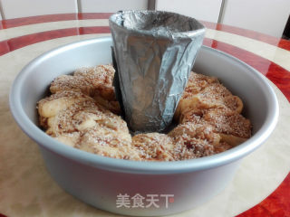 点击查看大图12.将辫子的两头连接,放入10寸圆形蛋糕模,中间放一纸杯(用锡纸包好),保持成品中间空心(不喜中空,则免纸杯)。