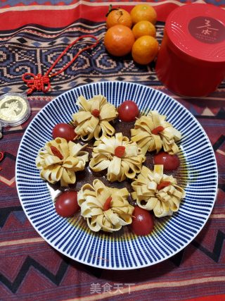 点击查看大图13.如图,把六朵豆腐皮花朵摆在碟中,小番茄摆在每朵花间隔中淋上酱汁。