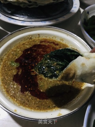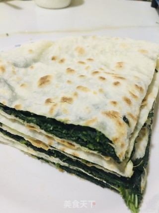 一种地方特色小吃,流行于中原地区的一种美食。洗净的番薯叶控干水分,擀好两张薄饼,把番薯叶摊放在一张饼上,再用另一张饼盖住,把周边压紧,活脱脱一个大大的菜包子,放入烙饼锅中,小火慢㸆,待下面起花,大翻身再将另一面烙熟,夹在中间的番薯叶也自然烙熟了。食时切四牙,从中间揭开,卷成卷卷,蘸蒜泥汁子,美味无比。
