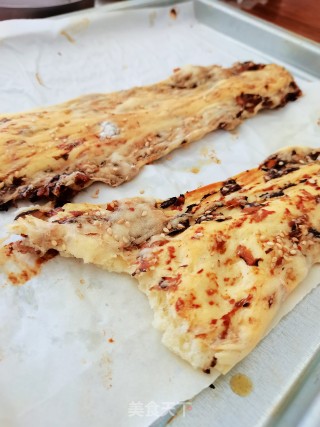 点击查看大图5.用擀面杖将饼擀成长方形,尽量薄一些,烤得时候可以更脆。馅儿露出来也没有关系,一样很好看,饼上撒上白芝麻