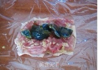 点击查看大图5.把腌好的鸡腿肉皮向下,下层铺一层稍大张的保鲜膜,把切小块的皮蛋一字排开在鸡腿肉的中间。