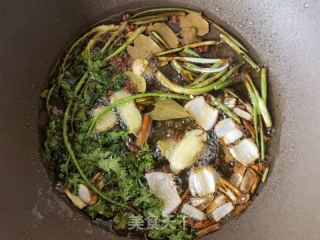 点击查看大图11.放入花椒,香叶,桂皮,小葱,洋葱,洋葱苗,香菜。