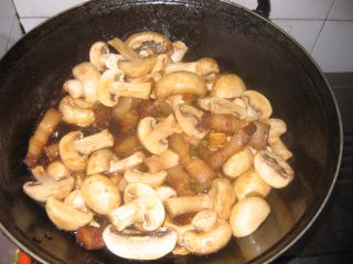 双孢菇水分大,如果水放的太多,就会菜汁太多、所以一定水只要漫过肉就可以了。