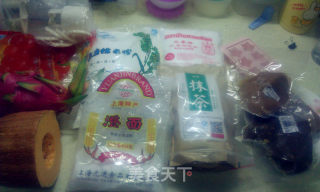 点击查看大图8.火龙果皮泥、南瓜泥、糕粉、巧克力酱、抹茶粉全部准备好。