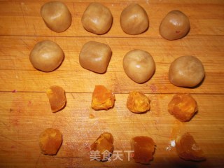 点击查看大图15.白莲蓉馅和牛肉馅整理成大小一致的剂子,我的月饼模具直径是5厘米的,一个蛋黄太大,就分成两块用。
