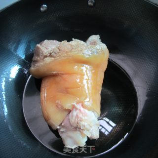 点击查看大图12.将煎焦黄的肘子去骨切大块,不要切段。骨不去也行。 在切好的肘子上抹上精盐,红油豆豉,调味鲜,蜂蜜。