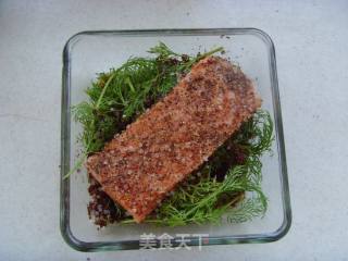 点击查看大图6.将另一条鱼排叠在容器里的鱼排上,最上面撒上剩余的糖盐混合物,铺一层茴香枝叶。
