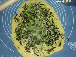 点击查看大图13.饼干料取出,取适量先擀成薄片,撒上香葱和紫菜碎,折叠揉匀。