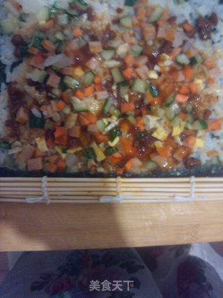 寿司是日本人最喜爱的传统食物之一,主要材料是用醋调味过的冷饭,再加上鱼肉,海鲜,蔬菜或鸡蛋等作配料,其味道鲜美,很受日本民众的喜爱。这次我是根据我个人的喜好,主要以蘑菇肉酱为主要调味料制作的,非常美味哦。。。