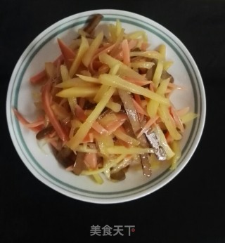 昨儿没买菜.就搜刮搜刮了一下冰箱.找到腌咸生姜.火腿肠.茶干.就造了这盘.佐烫饭最佳.感觉有点小惊喜.!好吃!