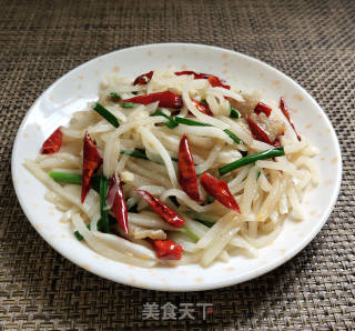 1白萝卜去皮,斜切成片再切成粗丝。2干辣椒切段、葱切段、蒜切末、肥肉切小块。3锅内加底油,下肥肉煎出油,煎成油渣状。4再下蒜末、干辣椒炒香。5下萝卜丝大火翻炒一分钟。6最后放葱段,调入盐和鸡精炒几下入味。7成品图。小窍门1、萝卜切成丝状很容易熟,入锅后全程大火翻炒,这样才能保留爽脆的口感。2、家里有肥肉的话建议煎点猪油来炒,这样炒出来的萝卜丝味道更香。3、干辣椒可起到增香带微辣口感,喜欢大辣的可适当加入一些指天椒。