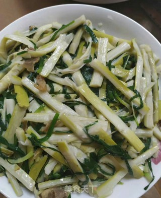 1竹笋切丝焯水,晾干。2肥肉加蒜姜爆炒出油。3倒入竹笋翻炒均匀。4再加韭菜,翻炒,加调料炒熟即可。5竹笋比较吸油,用肥一些的猪肉炒更香哦。