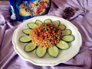 1制作教程;准备;方便面、火腿肠、胡萝卜、红椒、荷兰豆,黄瓜,2黄瓜切片如图片拍盘,3.胡萝卜,红椒、火腿肠切好备用,3锅里烧水放入方便面和调料,煮沸之后即可捞出沥干水分备用,另个锅烧油倒入切好的胡萝卜、火腿肠、红椒,4锅里加入适量的蚝油翻炒均匀,继续倒入备用的方便面和调料翻炒均匀即可。