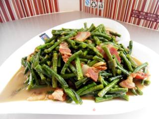 豇豆的做法可以烧制热菜,也可以腌制泡菜,还可以晾晒干菜。同样一种食材,由于加工方法的不同,成品菜肴的口感和口味差别很大。这道“培根豇豆”就是用烧制的方法烹制的一道热菜。