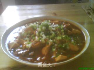 1先把豆腐切成小块,放到涨水中焯1-2分钟。2牛肉末用酱油,淀粉,稍微腌制一下。3起锅到油,先把花椒粒放入锅中,有香味后捞出颗粒,放入牛肉末,变色后先捞出。4放入蒜,姜末,在放入豆瓣酱抄出红油,加入高汤。5汤涨起在把炒好的豆腐,牛肉末放入,加盐,鸡精,大约一分钟后勾芡。6出锅后在表面撒上花椒末,和葱花,即可。